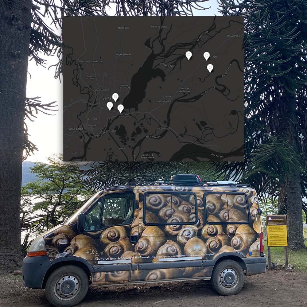Para este proyecto se ha equipado una camioneta Master como mini motor home que está intervenida, cual objeto encontrado se transformó en obra. La imagen nace en «Petos y Corazas» que está compuesta de los caracoles característicos de la ribera de la Setúbal, el Colastiné, todos parte del Río Paraná y palabras con el título de la obra y referencias.